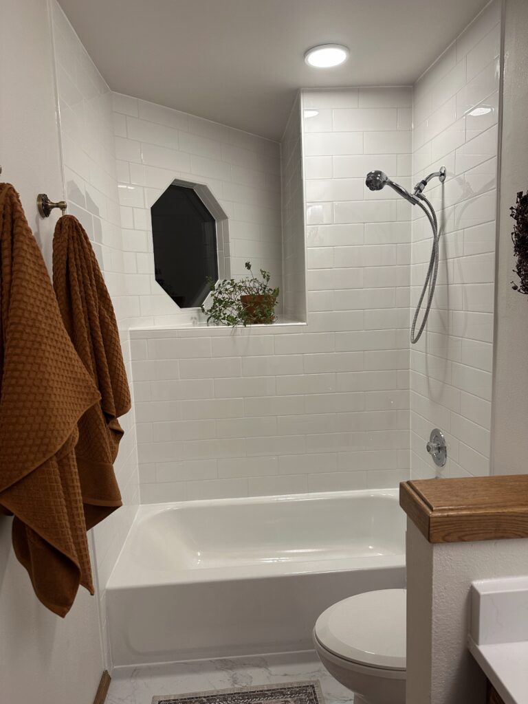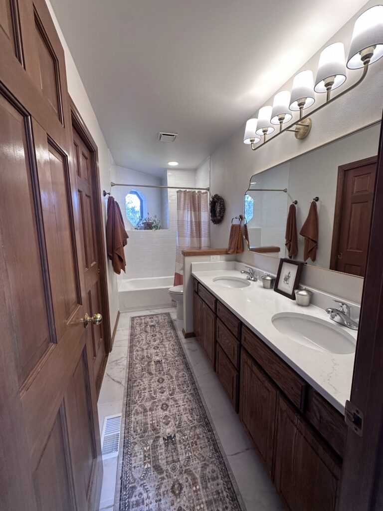 Tile showers, vanities, flooring, ventilation, and waterproofing details done with care.